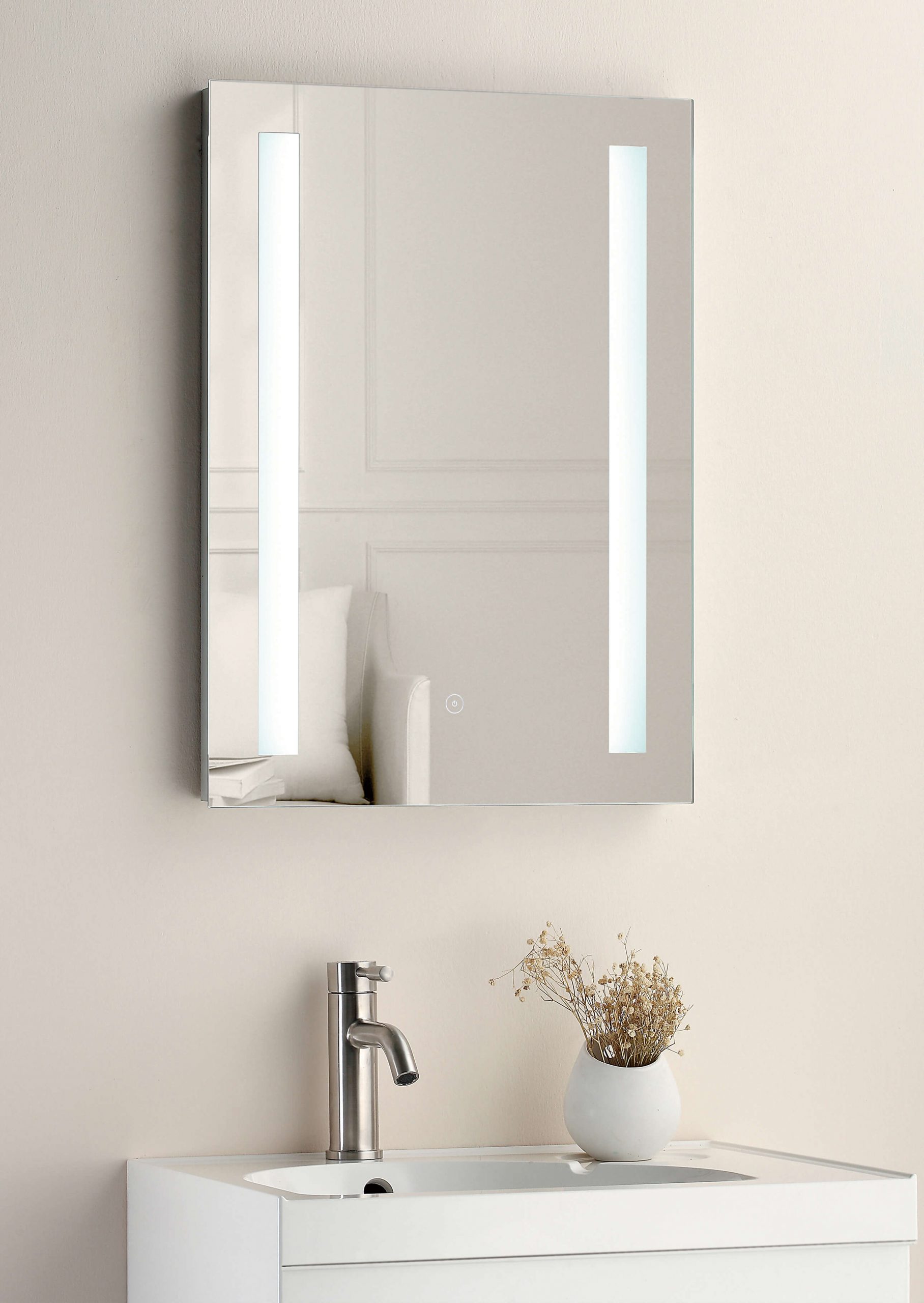 Classic contemporary styled rectangular mirror with LED strip lighting.